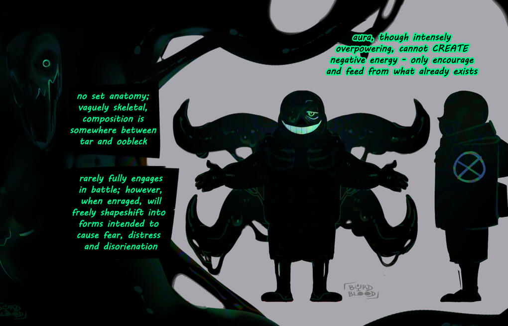 The leader and eponym of "Nightmare's Pantheon". Nightmare is a dangerous primordial deity seeking to spread fear and negativity throughout Multiverse TAU, to which he has gradually amassed a small group of dangerous monsters; criminals, cannibals, outcasts and murderers, all of whom either caused incredible misery in their original universes, or were willing to cause it in order to escape them. However, given that TAU is mostly populated by monsters — under normal circumstances, entities known for clinging to love, hope and compassion — recent years have seen him beginning to flag behind his twin, the more beloved half of the "twin deity" responsible for maintaining the balance of emotion after the destruction of their primordial organ half a millennium ago.Nightmare's goals and nature alike remain points of fierce contention... but if nothing else, the fact remains that he is a force of nature as cold and unknowable as the ocean's depths, backed by men who bear his black mark with pride.
